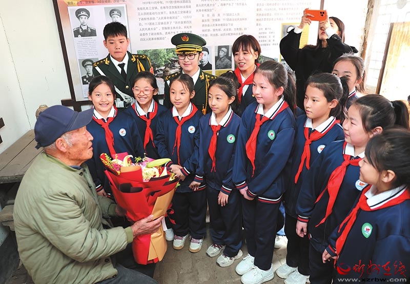 3月27日,忻州市七一路小學(xué)組織黨員、少先隊員走進忻府區(qū)官莊村原忻縣(西)第一個紅色黨支部官莊黨支部舊址,開展“傳承紅色薪火,爭做新時代好隊員”主題活動,追憶崢嶸歲月,感悟革命精神。圖為老兵武三毛給孩子們講述抗戰(zhàn)故事。(記者 張存良攝)