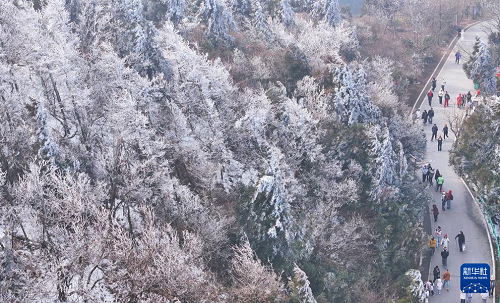 連日來,湖南省衡陽市南岳衡山風(fēng)景區(qū)出現(xiàn)霧凇云海景觀,壯美如畫的景色吸引眾多游客前來觀賞游玩。