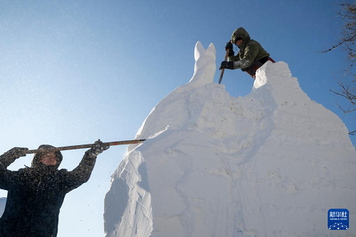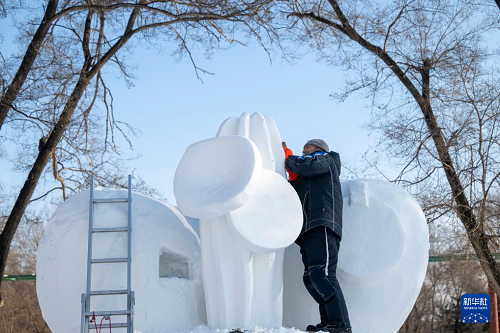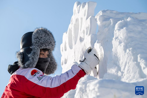 1月7日,在哈爾濱太陽島雪博會園區(qū),來自13個國家的25支代表隊百余位藝術(shù)家在寒冬中堅持藝術(shù)創(chuàng)作,精雕細琢雪雕作品。