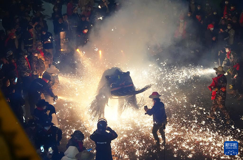 “蜀河燒獅子”于每年農(nóng)歷正月十三至十六舉行。夜幕降臨后,舞獅隊(duì)伍會(huì)走街串巷,在家家戶戶門前停留,通過(guò)舞獅來(lái)傳遞祝福。在此過(guò)程中,表演人員和圍觀群眾會(huì)點(diǎn)燃特制的煙花,朝“獅子”噴射火花。根據(jù)當(dāng)?shù)亓?xí)俗,“燒獅子”象征迎來(lái)好運(yùn)與吉祥,火花越猛,新年的運(yùn)勢(shì)越興旺。