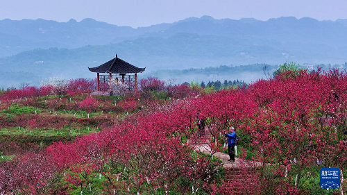 3月5日,游客在四川省瀘州市納溪區(qū)上馬鎮(zhèn)的桃林里賞花游玩(無人機(jī)照片)。(新華社發(fā) 廖勝春 攝)