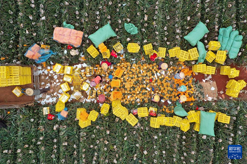 3月12日,農(nóng)民在??诖笃骆?zhèn)將鳳梨打包裝箱(無(wú)人機(jī)照片)。(新華社記者 郭程 攝)