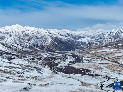3月15日,青海省果洛藏族自治州瑪沁縣雪后迎來晴好天氣,群山被白雪覆蓋,與藍(lán)天相映,構(gòu)成一幅壯美的高原春日圖景(無人機照片)。(新華社記者 張龍 攝)