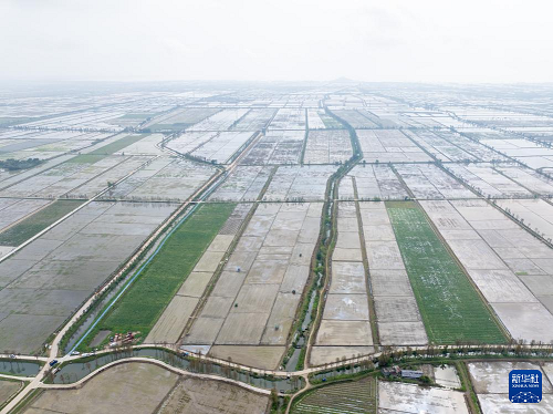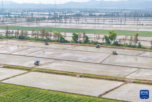 3月24日,在廣東江門臺山市都斛鎮(zhèn),農(nóng)業(yè)無人機在插好秧苗的田間作業(yè)(無人機照片)。(新華社記者 毛思倩 攝)