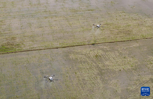 3月24日,在廣東江門臺山市都斛鎮(zhèn),農(nóng)業(yè)無人機在插好秧苗的田間作業(yè)。(新華社記者 毛思倩 攝)