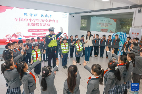 3月30日,在湖北省武漢市武昌區(qū)濱江實驗第一小學(xué),交警指導(dǎo)學(xué)生體驗交通安全手勢操。(新華社發(fā) 趙軍 攝)