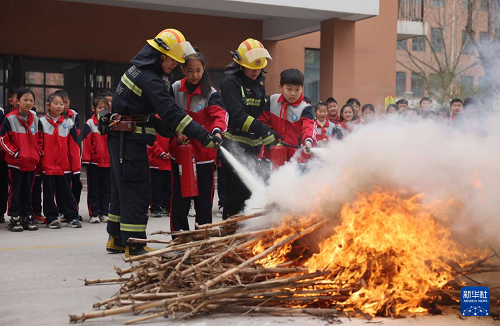 3月30日,在山東省臨沂市沂南縣第六實驗小學(xué),消防救援人員指導(dǎo)學(xué)生正確使用滅火器滅火。(新華社發(fā) 王彥冰 攝)