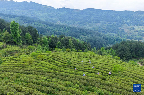 4月9日,茶農(nóng)在青龍鄉(xiāng)茶葉基地內(nèi)采摘春茶(無人機照片)。(新華社記者 唐奕 攝)