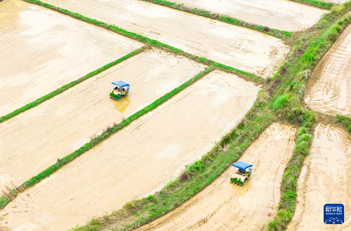 4月9日,江西省九江市都昌縣汪墩鄉(xiāng)細橋村,農(nóng)民駕駛插秧機進行插秧作業(yè)(無人機照片)。(新華社發(fā) 傅建斌 攝)