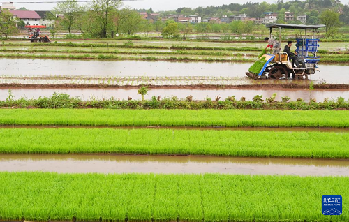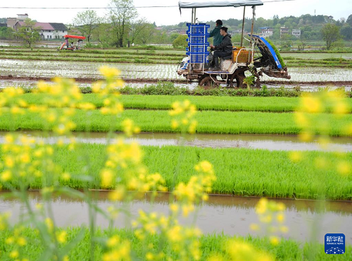 4月11日,湖南省衡陽市祁東縣金橋鎮(zhèn)村民駕駛插秧機進行早稻插秧工作。(新華社發(fā) 曹正平 攝)