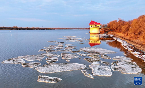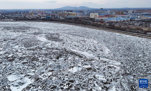 這是4月9日傍晚拍攝的松花江干流哈爾濱段流冰景觀(無人機(jī)照片)。(新華社發(fā) 張樹 攝)