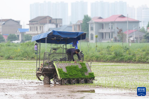 4月16日,在湖南省益陽(yáng)市南縣南洲鎮(zhèn),工人在調(diào)整插秧機(jī)。(新華社記者 陳振海 攝)