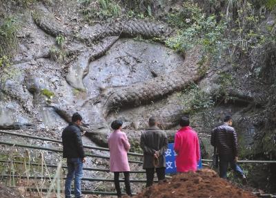 昨天,多批當?shù)赜慰蛠淼绞埱逵倬S護工程現(xiàn)場,觀看石龍。這些游客均稱,他們是看了網(wǎng)上關(guān)于該石龍與張獻忠“江口沉銀”有關(guān)系的報道后,慕名前來。
