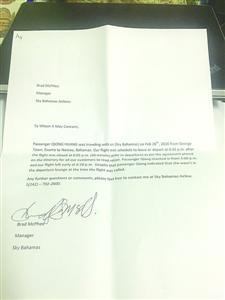 SkyBahamas航空公司給黃小姐開了一張情況說明,稱飛機(jī)確實(shí)早于18點(diǎn)45分起飛。