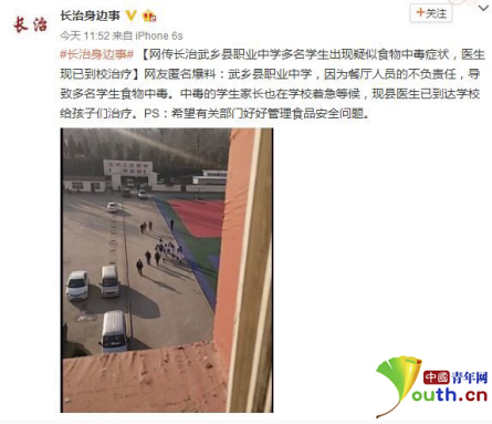 中國(guó)青年網(wǎng)記者就此事向武鄉(xiāng)縣職業(yè)中學(xué)進(jìn)行求證,該校辦公室劉老師稱(chēng),目前有二十余位同學(xué)在縣人民醫(yī)院住院治療。事情發(fā)生后學(xué)校領(lǐng)導(dǎo)高度重視,縣領(lǐng)導(dǎo)和教育局領(lǐng)導(dǎo)也都前往醫(yī)院看望生病學(xué)生。