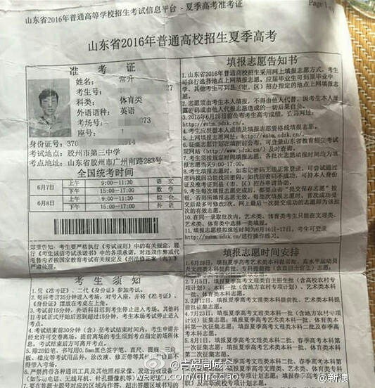 “如果不是他收到了通知書,我永遠(yuǎn)也不會知道這個秘密。”常升告訴記者,他口中的“他”是室友兼摯友郭某。常升和郭某都是體育特長生,兩人今年高考成績相仿,在填報志愿的當(dāng)天,先后用體育老師遲老師的電腦填報了志愿,均為陜西師范大學(xué)的免費師范生。但是錄取通知一下,常升傻了眼,自己并沒有被錄取,但是比自己分?jǐn)?shù)更低的郭某卻收到了錄取通知書,而且陜西師范大學(xué)在山東招收的免費師范生還沒有招滿,種種情況讓常升十分不理解。圖為常升高考相關(guān)信息。