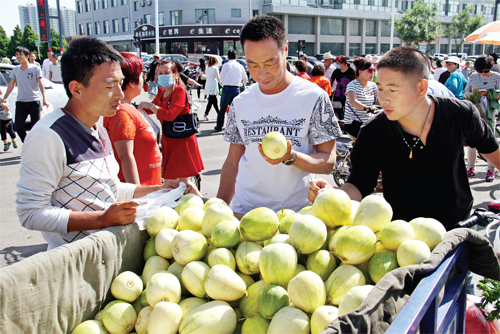 5 月29 日,原平市王家莊鄉(xiāng)弓家莊村的農(nóng)民正在農(nóng)貿(mào)市場銷售大棚香瓜、蔬菜。近年來,該市加大財政扶持力度,加快產(chǎn)業(yè)結構調(diào)整,大力發(fā)展蔬菜大棚。目前,該村戶均1座大棚,人均產(chǎn)值1.5 萬元。(褚震 攝)