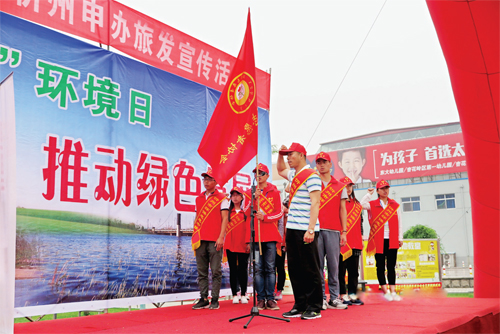 6 月5 日上午,第四十五個世界環(huán)境日宣傳活動在我市體育廣場舉行。圍繞“改善環(huán)境質量,推動綠色發(fā)展”主題,市環(huán)保局開展了百人騎行、文藝演出、助力忻州旅游投票等活動。圖為我市環(huán)保志愿者協(xié)會志愿者代表正在宣誓。(王君 攝)