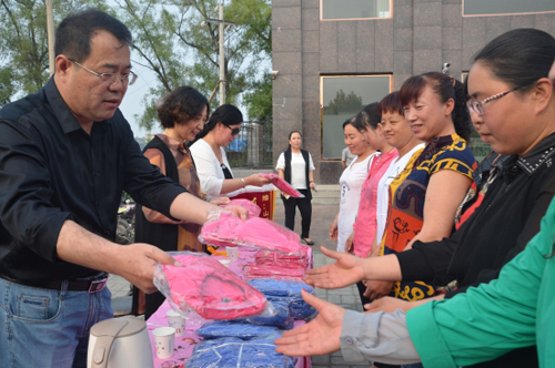 福來(lái)珠寶向環(huán)衛(wèi)工人捐贈(zèng)T裇衫,環(huán)衛(wèi)處處長(zhǎng)石建新(左一),福來(lái)珠寶總經(jīng)理趙曉平(左二)、環(huán)衛(wèi)處副處長(zhǎng)張林霞(左三)參加捐贈(zèng)儀式。