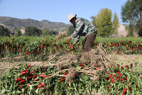10月8日,靜樂縣永倉種植專業(yè)合作社萬畝辣椒種植示范園中10300畝辣椒喜獲豐收。近年來,該縣調(diào)整產(chǎn)業(yè)結(jié)構(gòu),大力發(fā)展無公害辣椒種植,引進(jìn)種植新品種韓國紅辣椒。該合作社今年連片訂單栽植的10300 畝辣椒目前長勢良好,預(yù)計平均畝產(chǎn)6000 斤,最高可達(dá)一萬斤。今年又是一個豐產(chǎn)年,大伙的生活就像紅辣椒一樣過得紅紅火火。圖為合作社工人在收獲辣椒。(閆曉梅 攝)