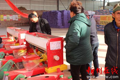 11月17日,來自原平市西鎮(zhèn)鄉(xiāng)的幾位農(nóng)民在聚農(nóng)豐測(cè)土配肥中心選擇新型“雙胞胎”播種機(jī),該機(jī)采用一穴雙株,寬窄行種植,畝留苗可比傳統(tǒng)播種機(jī)每畝增加上千株,增產(chǎn)20%以上,成為今后農(nóng)民的首選播種機(jī)。(曹申義 攝)