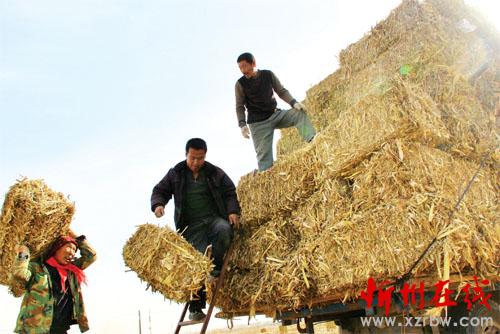 11月19日,定襄縣宏道鎮(zhèn),大型秸稈打捆機(jī)正在無(wú)畏莊村農(nóng)田里進(jìn)行秸稈打捆,兩臺(tái)農(nóng)運(yùn)車運(yùn)輸,每捆4元銷售給河邊10萬(wàn)千瓦風(fēng)電場(chǎng),既得利益又環(huán)保又防火災(zāi),一舉三得。據(jù)了解,宏道鎮(zhèn)該臺(tái)打捆機(jī)是河邊10萬(wàn)千瓦風(fēng)電場(chǎng)無(wú)償提供的,與本鎮(zhèn)大型拖拉機(jī)配套,實(shí)施秸稈打捆1個(gè)多月,已經(jīng)將1000多畝農(nóng)田的秸稈打捆,讓農(nóng)民的廢秸稈也賺錢,實(shí)現(xiàn)了防火、環(huán)保、秸稈再利用。圖為工作人員將捆好的秸稈裝車。(吉建平 攝)