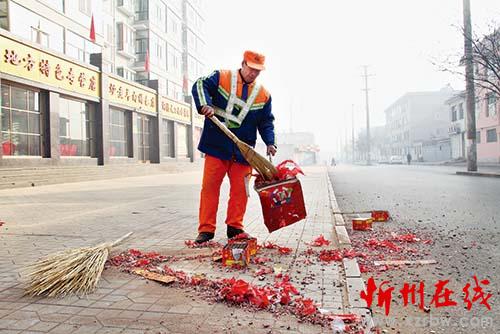 2月3日,年后上班首日,原平市的環(huán)衛(wèi)工人在清理街面的“開(kāi)門(mén)炮”碎屑。部分商家仍有燃放“開(kāi)門(mén)炮”的習(xí)慣,意為年后開(kāi)張討個(gè)好彩頭。燃放過(guò)后,環(huán)衛(wèi)工人四處奔忙,集中清理滿地碎屑,增加了繁重的工作量。(褚震 攝)