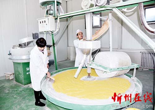 代縣南北兩半坡所產(chǎn)的小米,由于地理環(huán)境特殊,無霜期長,光照充足,晝夜溫差大,不僅色澤金黃品質(zhì)優(yōu),而且口感好,久負盛名,十分走俏。該公司用石碾加工小米,以散裝每公斤14元、高檔包裝每公斤16元出售,銷往北京、太原等地。圖為公司員工用石碾加工小米(石俊文 劉睿)