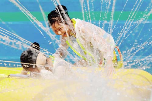 7月16日,孩子們?cè)诮K省淮安市盱眙縣玉皇山水上樂(lè)園戲水消暑。新華社 周海軍 攝