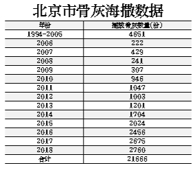 目前,以骨灰海葬、骨灰自然葬為代表的節(jié)地生態(tài)葬式已成為北京市骨灰安葬的主流。本市骨灰海葬活動自1994年實(shí)施以來,迄今已順利組織了485次,播撒骨灰21666份,服務(wù)逝者家屬67887人次,僅2018年就組織骨灰撒?;顒?0批次,播撒骨灰2760份,參加活動家屬11160人,在全國居于領(lǐng)先地位?!笆濉蹦腔液T崃款A(yù)計將達(dá)到北京市年火化總量的4%。