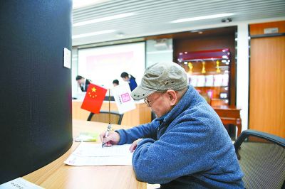 4月3日,中華遺囑庫第二登記中心揭牌成立,前來體驗(yàn)遺囑辦理程序的老人蔡先生正在填寫相關(guān)登記表。(記者 和冠欣 攝)