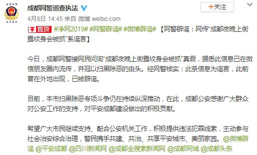 4月8日,成都網(wǎng)警對(duì)此辟謠稱:接網(wǎng)民問詢“成都夜晚上街露紋身會(huì)被抓”真假,據(jù)悉此信息已在微信朋友圈內(nèi)流傳,并冠以掃黑除惡的由頭。經(jīng)網(wǎng)警核實(shí),此條信息為謠言,此前曾在外地出現(xiàn),已被辟謠。目前,本市掃黑除惡專項(xiàng)斗爭(zhēng)仍在持續(xù)縱深推動(dòng),在此,成都公安感謝廣大群眾對(duì)公安工作的支持,對(duì)平安成都建設(shè)做出的積極貢獻(xiàn)。希望廣大市民繼續(xù)支持、配合公安機(jī)關(guān)工作,積極提供違法犯罪線索,主動(dòng)參與社會(huì)治安綜合治理,警民攜手共建、共治、共享平安城市、美麗家園。