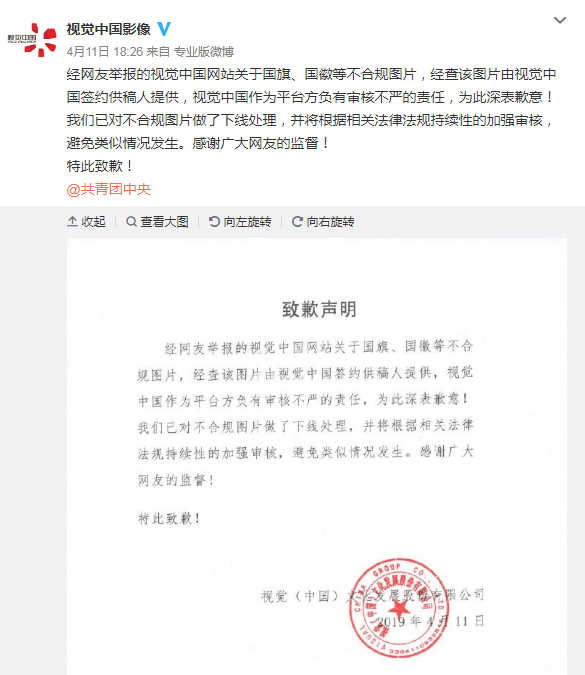 4月11日,視覺(jué)中國(guó)因黑洞照片版權(quán)問(wèn)題引發(fā)公眾質(zhì)疑,共青團(tuán)中央官方微博更是直接質(zhì)問(wèn)“國(guó)旗、國(guó)徽版權(quán)也是貴公司的?”直指其版權(quán)不合理售賣問(wèn)題。視覺(jué)中國(guó)官方微博當(dāng)日回應(yīng),經(jīng)網(wǎng)友舉報(bào)的視覺(jué)中國(guó)網(wǎng)站關(guān)于國(guó)旗、國(guó)徽等不合規(guī)圖片,經(jīng)查該圖片由視覺(jué)中國(guó)簽約供稿人提供,視覺(jué)中國(guó)作為平臺(tái)方負(fù)有審核不嚴(yán)的責(zé)任,為此深表歉意!已對(duì)不合規(guī)圖片做了下線處理,并將根據(jù)相關(guān)法律法規(guī)持續(xù)性的加強(qiáng)審核,避免類似情況發(fā)生。
