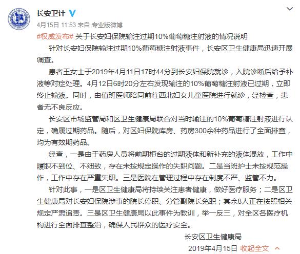 長安區(qū)市場監(jiān)管局和區(qū)衛(wèi)生健康局聯(lián)合對當(dāng)時輸注的10%葡萄糖注射液進(jìn)行認(rèn)定,確屬過期藥品。隨后,對區(qū)婦保院庫房、藥房300余種藥品進(jìn)行了全面排查,均為有效期藥品。