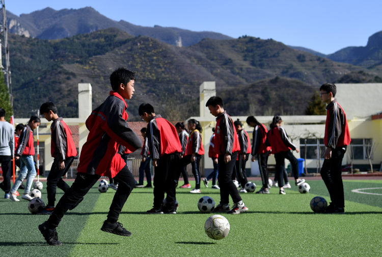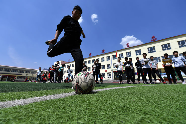 ↑這是學(xué)生們下課后在球場上踢足球(4月17日攝)。新華社記者詹