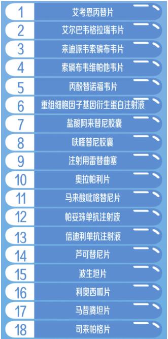 國(guó)家醫(yī)保局醫(yī)藥服務(wù)管理司司長(zhǎng)熊先軍介紹,此次談判成功的藥品多為近年來新上市且具有較高臨床價(jià)值的藥品,涉及癌癥、罕見病、風(fēng)濕免疫、心腦血管、消化等10余個(gè)臨床治療領(lǐng)域。重點(diǎn)領(lǐng)域的5個(gè)基本藥物全部談判成功,22個(gè)抗癌藥、7個(gè)罕見病用藥、14個(gè)慢性?。ê悄虿 ⒁腋?、風(fēng)濕性關(guān)節(jié)炎等)用藥、4個(gè)兒童用藥談判成功,進(jìn)一步優(yōu)化了目錄結(jié)構(gòu)。