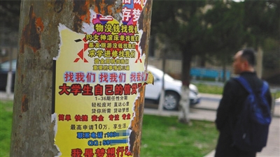 張貼在鄭州一大學(xué)校園內(nèi)的校園網(wǎng)貸廣告。新京報(bào)記者 曹曉波 攝