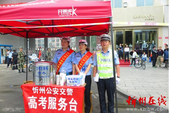 交警、武警等工作人員維持著現(xiàn)場(chǎng)秩序,設(shè)立高考服務(wù)臺(tái),為考生送上溫馨服務(wù)。