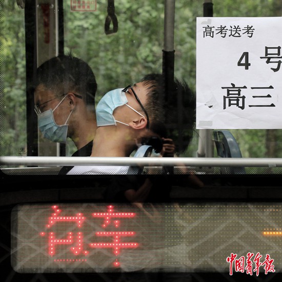 7月7日上午,四川省成都市,剛剛參加完高考語文考試的一位考生坐在車上閉目養(yǎng)神。由于考點(diǎn)不在本校,這位學(xué)生所在的學(xué)校安排了專車接送考生。中青報·中青網(wǎng)記者 王鑫昕/攝