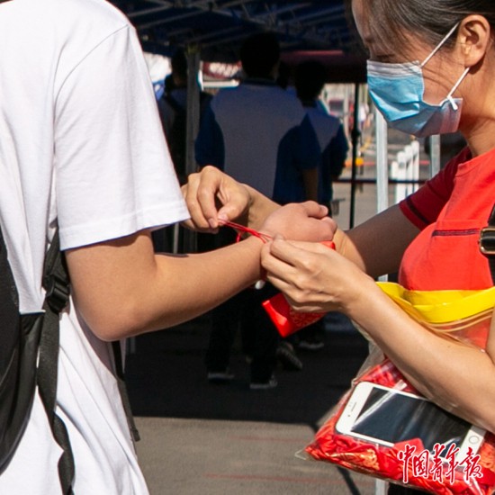 7月7日上午,北京市陳經(jīng)綸中學(xué)門口,一位老師為考生戴上代表幸運(yùn)的紅手鏈。中青報·中青網(wǎng)見習(xí)記者 曲俊燕/攝