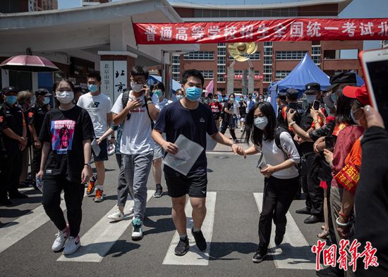 7月7日上午,北京市豐臺區(qū),北京市第十二中學(xué)考點(diǎn),結(jié)束上午的考試后,高考考生們走出考場,一位考生從人群中牽起家人的手。當(dāng)天是2020年全國統(tǒng)一高考第一天,據(jù)了解,今年北京市高考在7月7日至10日舉行,共49000多名考生,設(shè)17個考區(qū),132個考點(diǎn)學(xué)校,2867個考場,每考場考生人數(shù)由過去的30人減至20人。中青報·中青網(wǎng)記者 李崢苨/攝