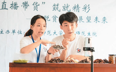 7月24日,在江西省吉安市新干縣潭丘鄉(xiāng)產(chǎn)業(yè)就業(yè)扶貧服務(wù)中心,江西師范大學(xué)暑期社會(huì)實(shí)踐大學(xué)生正在直播推銷當(dāng)?shù)剞r(nóng)家小吃醬餅,助力鄉(xiāng)村振興。李福孫攝(人民視覺)