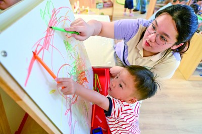 在江蘇省南京一家托育中心,一名小朋友在托育老師的陪伴下畫(huà)畫(huà)。新華社發(fā)