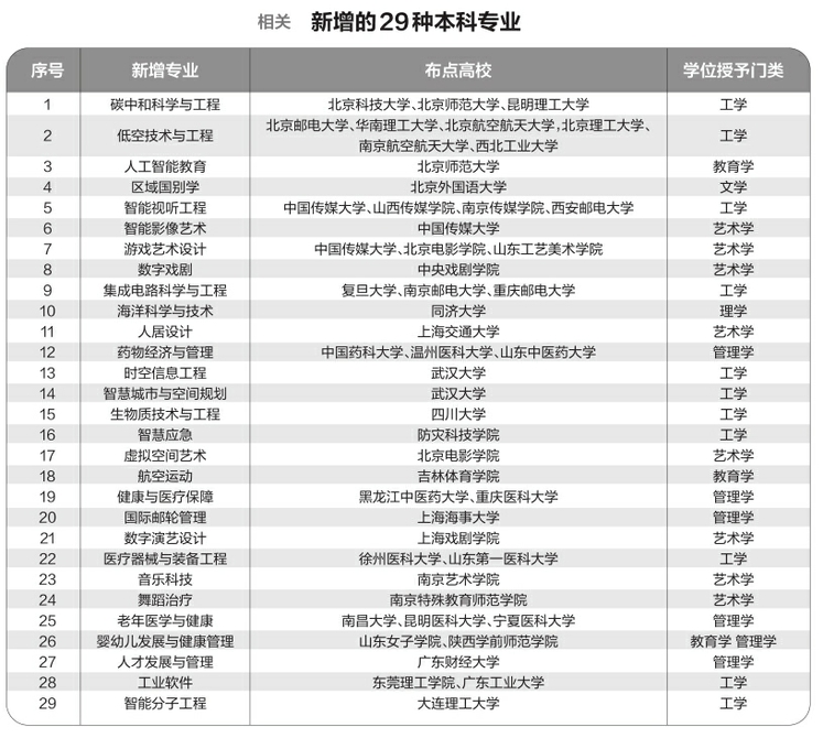 據(jù)悉,此次增設(shè)的29種新專業(yè),充分體現(xiàn)國家戰(zhàn)略、市場需求和科技發(fā)展?fàn)恳?,在服?wù)國家戰(zhàn)略方面,增設(shè)了區(qū)域國別學(xué)、碳中和科學(xué)與工程、海洋科學(xué)與技術(shù)、健康與醫(yī)療保障等專業(yè);面向科技發(fā)展前沿,增設(shè)了智能分子工程、醫(yī)療器械與裝備工程、時空信息工程等專業(yè);主動適應(yīng)市場需求,增設(shè)了國際郵輪管理、航空運(yùn)動等專業(yè)。同時,聚焦人工智能賦能經(jīng)濟(jì)社會發(fā)展,增設(shè)人工智能教育、智能視聽工程、數(shù)字戲劇等專業(yè)。