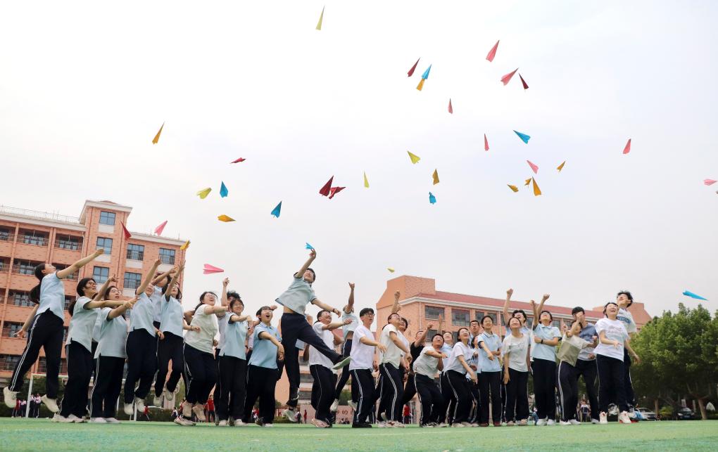5月22日,在山東省高密市第五中學(xué),高三學(xué)生將寫(xiě)有夢(mèng)想的紙飛機(jī)拋向空中。高考臨近,各地學(xué)校組織高三學(xué)生開(kāi)展不同形式的減壓活動(dòng),幫助學(xué)生放松心情,迎接高考。新華社發(fā)(李海濤攝)