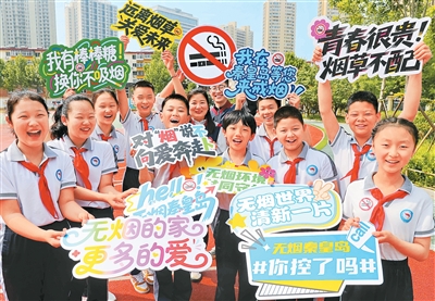 第38個“世界無煙日”到來之際,河北省秦皇島市疾控中心(市衛(wèi)生監(jiān)督所)工作人員走進秦皇島市第七中學玉龍灣校區(qū),為學生普及吸煙有害健康的相關知識。圖為工作人員和學生共同和禁煙標識、標語合影。曹建雄攝(人民視覺)