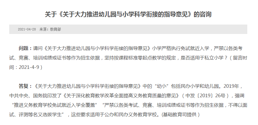 新華網(wǎng)北京4月28日電 近日,教育部在回應(yīng)網(wǎng)友咨詢(xún)《關(guān)于大力推進(jìn)幼兒園與小學(xué)科學(xué)銜接的指導(dǎo)意見(jiàn)》相關(guān)問(wèn)題時(shí)表示,該指導(dǎo)意見(jiàn)中的“幼小”包括民辦小學(xué)和幼兒園。2019年,中共中央、國(guó)務(wù)院印發(fā)了《關(guān)于深化教育教學(xué)改革全面提高義務(wù)教育質(zhì)量的意見(jiàn)》(中發(fā)〔2019〕26號(hào)),強(qiáng)調(diào)“推進(jìn)義務(wù)教育學(xué)校免試就近入學(xué)全覆蓋”“嚴(yán)禁以各類(lèi)考試、競(jìng)賽、培訓(xùn)成績(jī)或證書(shū)等作為招生依據(jù),不得以面試、評(píng)測(cè)等名義選拔學(xué)生”,這些要求適用于公辦和民辦義務(wù)教育學(xué)校。