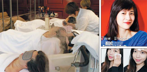 今年3月,在首爾新沙洞林蔭道,中國“網(wǎng)紅”們正在接受愛茉莉太平洋用韓方洗發(fā)水產(chǎn)品進(jìn)行的頭皮護(hù)理。右上方的圖片,是papi醬上月16日在上海進(jìn)行的粉絲見面會(huì)海報(bào)。下方的圖片是“網(wǎng)紅”周倩晗今年3月在自己微博上發(fā)布的韓國化妝品體驗(yàn)后記。