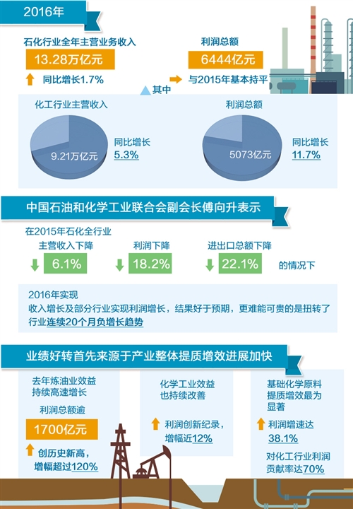 來自中國石油和化學(xué)工業(yè)聯(lián)合會的信息顯示,2016年,石化行業(yè)全年主營業(yè)務(wù)收入13.28萬億元,同比增長1.7%,利潤總額6444億元,與2015年基本持平;其中化工行業(yè)主營收入9.21萬億元、同比增長5.3%,利潤總額5073億元、同比增長11.7%。中國石油和化學(xué)工業(yè)聯(lián)合會副會長傅向升表示,在2015年石化全行業(yè)主營收入下降6.1%、利潤下降18.2%、進(jìn)出口總額下降22.1%的情況下,2016年實現(xiàn)收入增長及部分行業(yè)實現(xiàn)利潤增長,結(jié)果好于預(yù)期。更難能可貴的是,扭轉(zhuǎn)了行業(yè)連續(xù)20個月負(fù)增長趨勢。