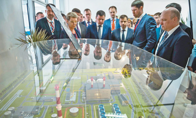 中國和俄羅斯合資建設(shè)的華電捷寧斯卡婭燃氣蒸汽聯(lián)合循環(huán)供熱電站項目投產(chǎn)儀式6月20日在俄羅斯雅羅斯拉夫爾市舉行。圖為嘉賓參觀華電捷寧斯卡婭電站項目沙盤模型。新華社發(fā)